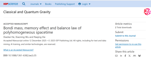 教师何孝凯教授与中国科学院数学与系统科学研究院数学研究所吴小宁研究员、复旦大学数学科学学院谢纳庆教授合作在国际著名引力物理期刊《Classical and Quantum Gravity》上在线发表了题为 “Bondi mass, memory effect and balance law of polyhomogeneous spacetime”的学术论文。