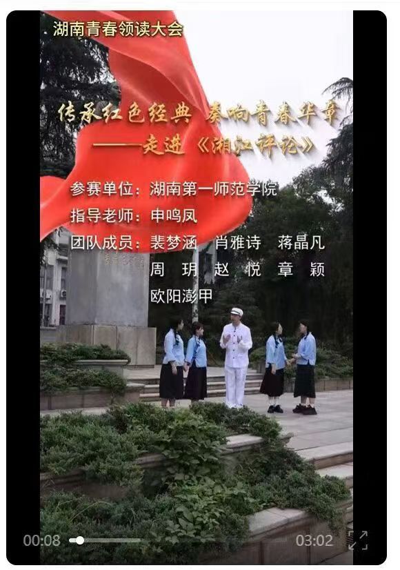 “湖南青春领读大会”由湖南省委网信办、湖南出版集团、中南传媒指导,湖南省高等学校图书馆工作委员会与潇湘晨报联合承办,是面向全省高校学子的一项重要文化赛事。从5月份开始,在指导教师申鸣凤的精心指导下,由裴梦涵等7位同学组成的团队,立足学校特色,经过反复研讨,最终选定以走进《湘江评论》为题。在确定主题后,团队从内容选择、脚本写作、现场拍摄,再到后期制作的配图配乐,每一个环节都全力以赴。为了能立体地、全方位呈现《湘江评论》的热血激昂,让文字的穿透力突破时空的壁垒,团队成员先后走进人妻 城南书院校区、修业学校、橘子洲头等曾经的初心之地,通过场景再现、名篇诵读、情景演绎等方式再现一个世纪前的呐喊,传递百余年前的时代强音,致敬气势磅礴的青春力量。