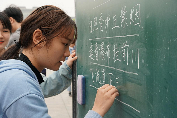 开幕式结束后,随即进行了粉笔字决赛。选手们依次进入决赛场地,等待主持人宣布“比赛开始”后,选手们在四四方方的小黑板前思考着、比划着。“一横一竖”“一撇一捺”如行云流水般游走在黑板上。比赛结束后,评委老师对参赛选手的作品进行了打分。