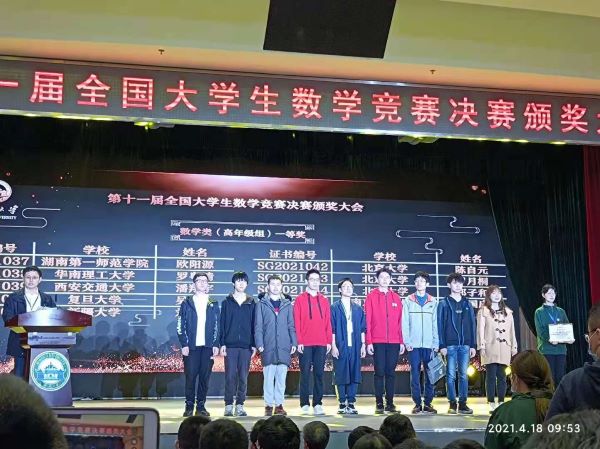 学生欧阳源同学与清华大学、北京大学、复旦大学等全国一流大学的学生同场竞技,经过激烈角逐,荣获数学类高年级组全国一等奖。这是人妻