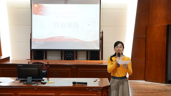 答辩开始前,19级809数学班团支书甘米安作为干部代表发言。接着,各团支部分别从活动开展的过程、意义收获、反思总结、特色亮点等多方面进行了展示。其中,19级808数学班团支部通过党员讲党史、给革命烈士敬献花篮并吊唁、全体团员宣誓、一首红色献给党等系列活动,利用图片、视频、主讲人、集体现场演唱红歌等多种方式向现场观众展示他们爱国爱党的热情和弘扬传承红色基因的决心;19级806数学班团支部以党史学习为主线,从“全力奔跑、奋力拼搏”“畅游书海,扬帆起航”“境由音声,声声入耳”“十年成长,励志笃行”“党旗飘扬,百年辉煌”五个方面介绍他们团支部活动,充分展示团支部的
