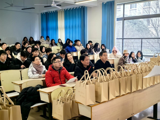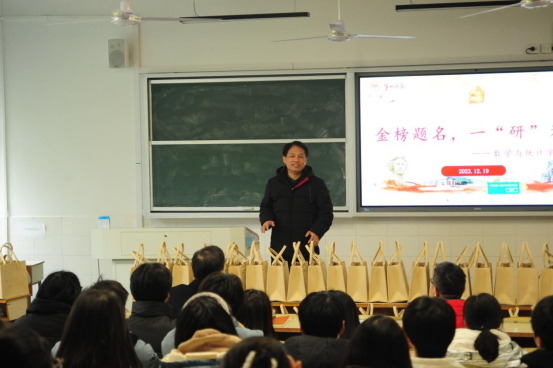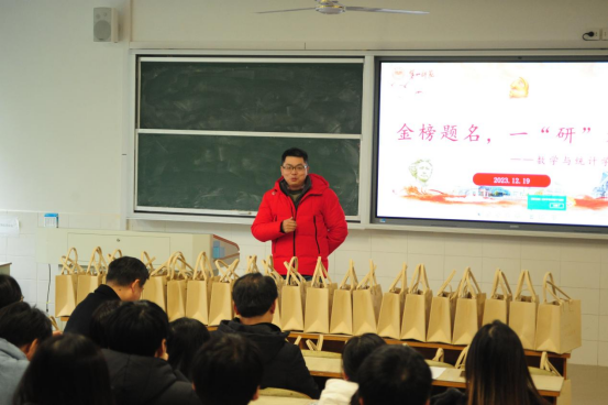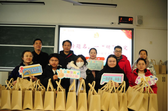 活动的最后,学院领导和老师们为同学们送上学院精心准备的“金榜题名”考研大礼包,并合影留念。代表“一帆风顺”祝福的数统院定制帆布袋中装满暖心且极富特殊寓意的慰问品,包括手写的加油书签、暖宝宝、可口可乐、口罩和“面试包过”面包,饱含了学院对考研学子们浓浓的关爱和殷切的期盼,希望同学们“研”途璀璨,蟾宫折桂!