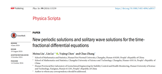 学生刘美娜在卢霖博士指导下,与湖南科技大学张超博士、长沙理工大学硕士陈玉晶合作,在数学物理领域国际学术期刊《Physica Scripta》发表了题为“New periodic solutions and solitary wave solutions for the timefractional differential equations”的学术论文。人妻