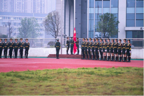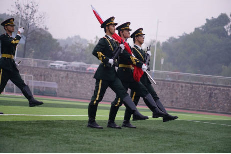 伴随着激昂乐章,国旗护卫队步伐铿锵,昂首挺胸地走向升旗台。在国歌的庄严旋律中,鲜艳的五星红旗在晨光中缓缓升起,全体师生肃穆站立,向国旗致以崇高的敬意,内心涌动着对祖国的深情厚意和无比的自豪感。