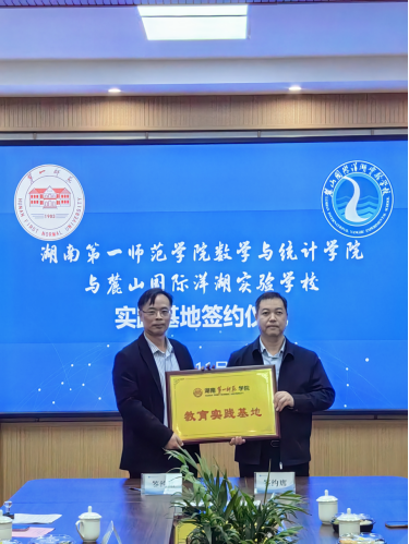 数学与应用数学专业的办学特色,人才培养成效、科学研究情况,以及未来发展方向与目标。麓山国际洋湖实验学校校长肖伟就实践教学基地建设的期待与展望与陈院长进行了深入交流。随后,双方签订了《实践教学基地建设协议书》,陈爱永院长和肖伟校长共同为实践教学基地揭牌。