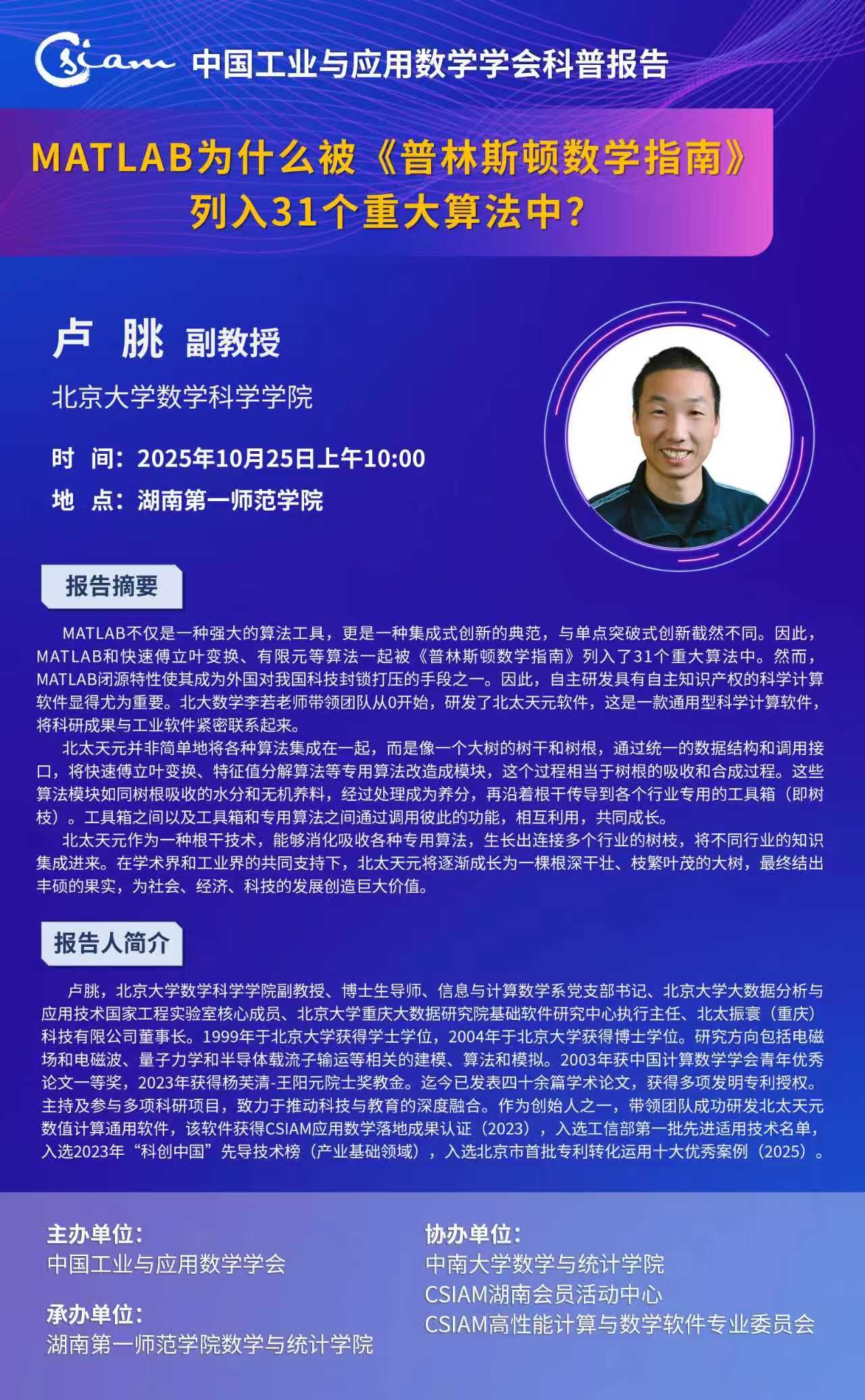 学术报告|数学高峰讲坛第75期:MATLAB为什么被《普林斯顿数学指南》列入31个重大算法中?