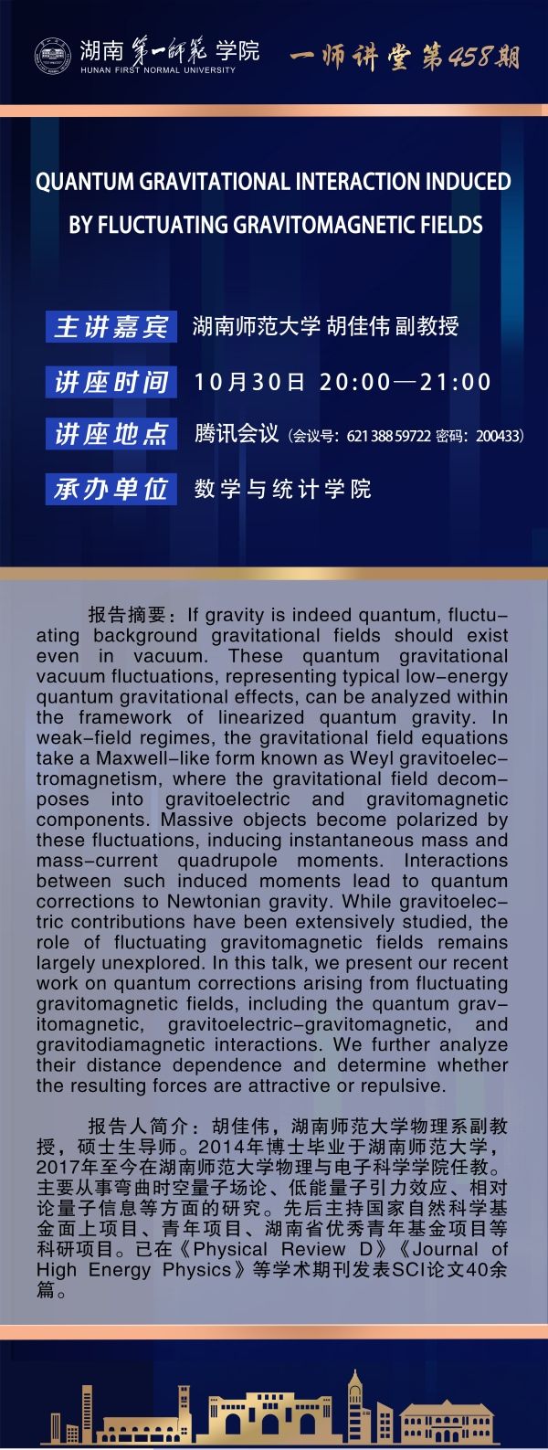 学术报告|数学高峰讲坛第77期:Quantum gravitational interaction induced by fluctuating gravitomagnetic fields 发布时间:2025-10-28 作者: 浏览次数:次