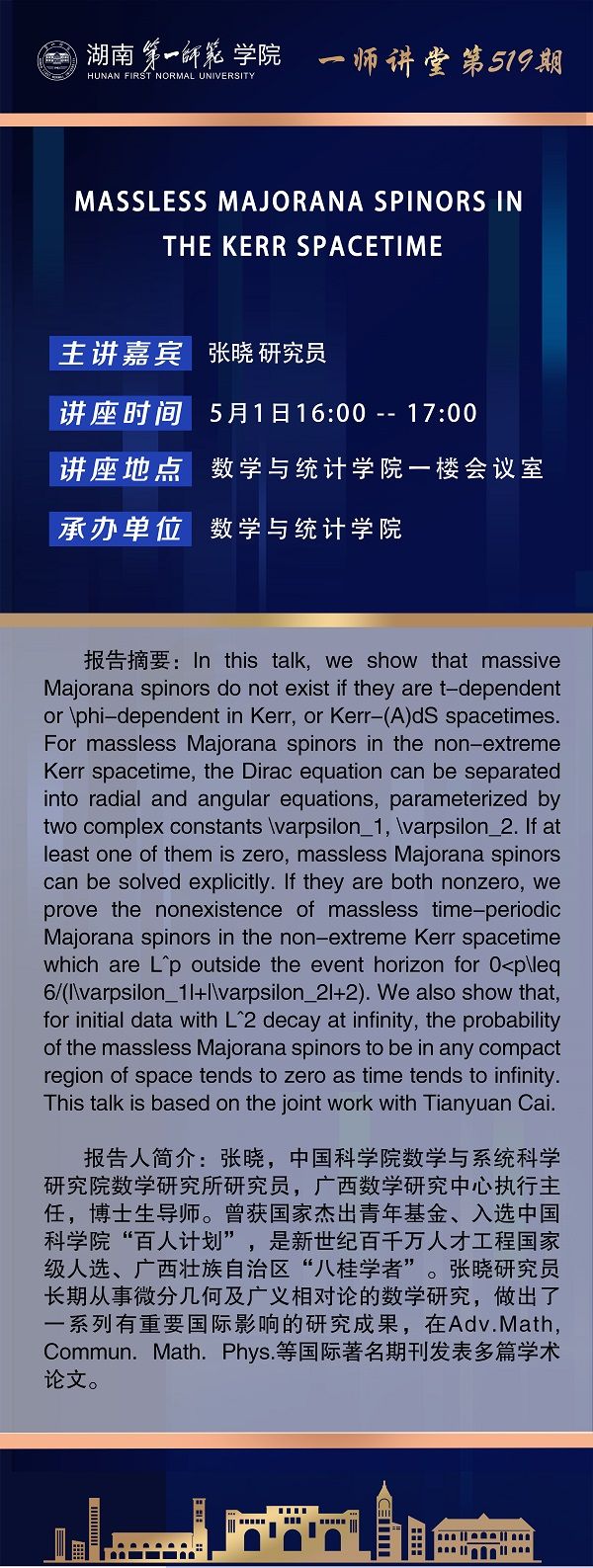 学术报告|数学高峰讲坛第92期:Massless Majorana spinors in the Kerr spacetime
