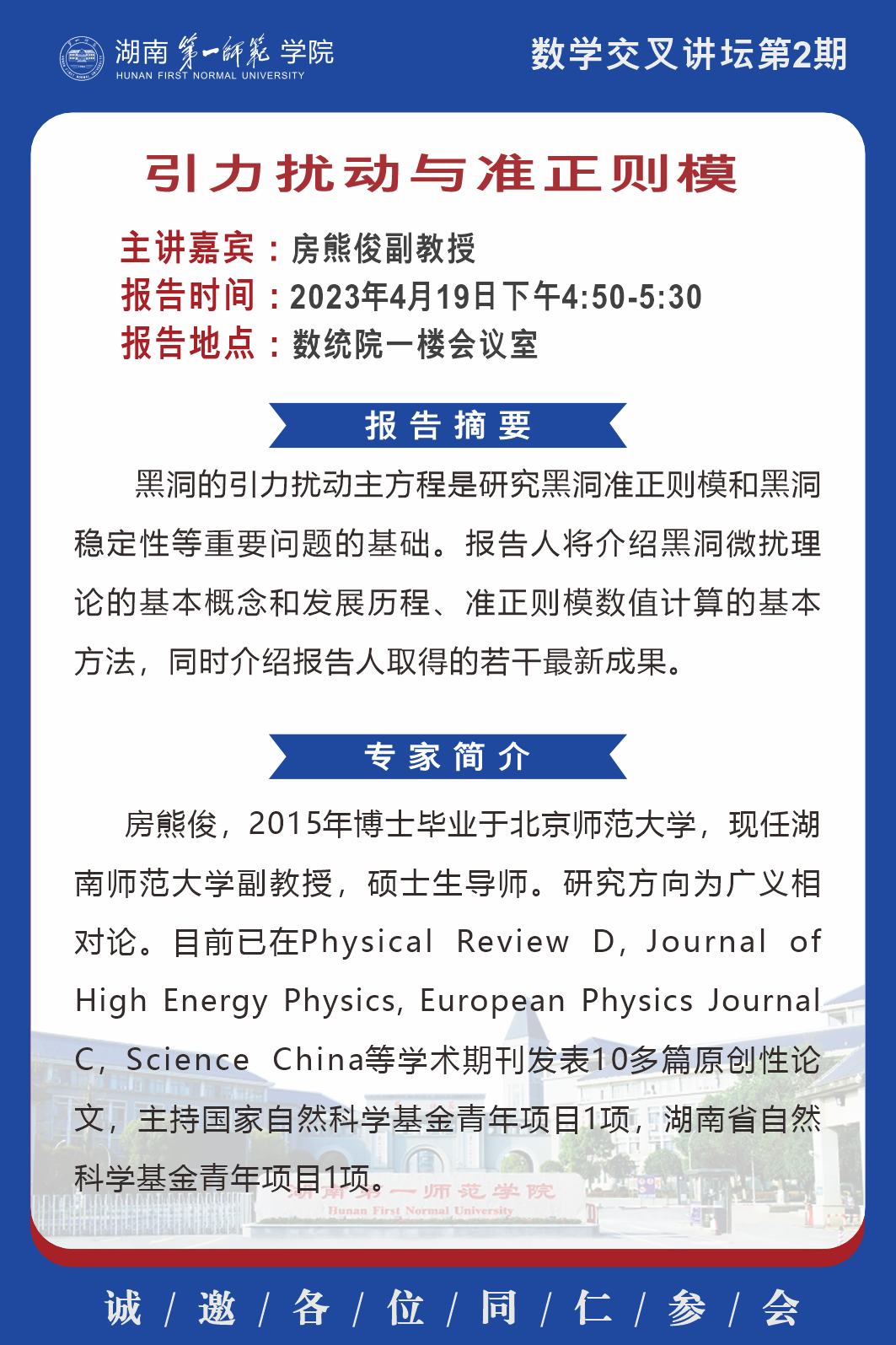 学术报告|数学交叉讲坛第2期:引力扰动与准正则模