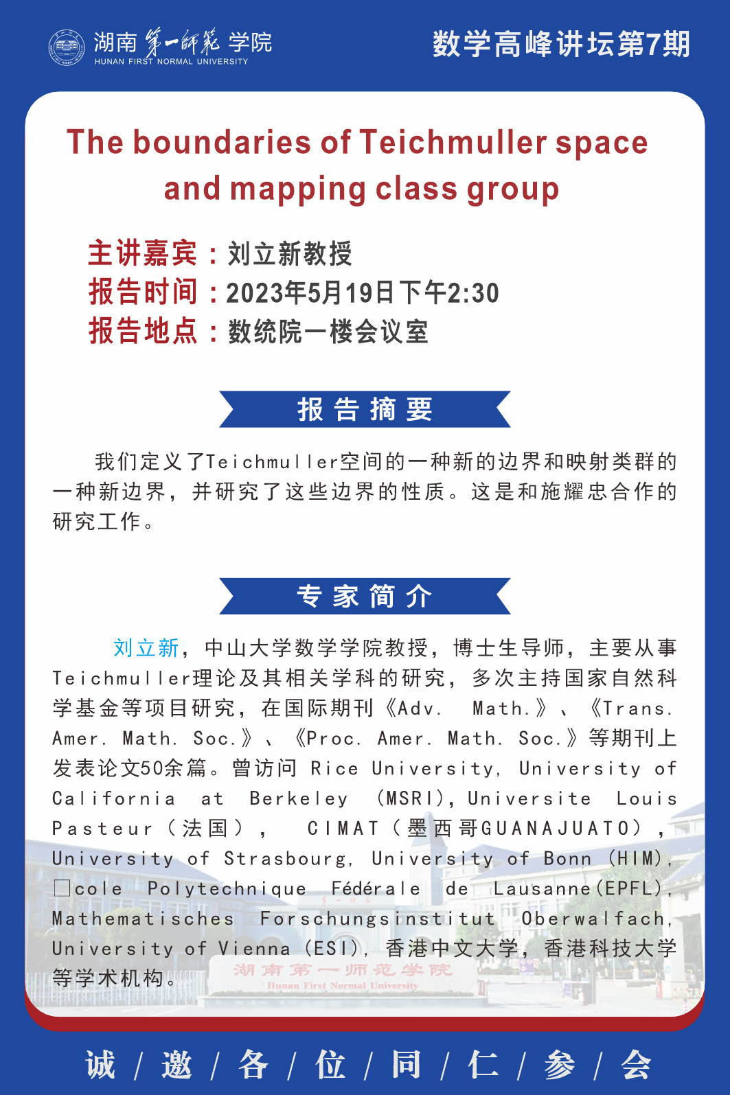 学术报告|数学高峰讲坛第7期:The boundaries of Teichmuller space and mapping class group 发布时间:2023-05-17 作者: 浏览次数:次