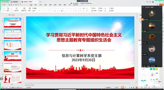 按照学校党委统一部署和数统院党委工作要求,9月20号晚上,信息与计算科学系党支部线上召开“学习贯彻习近平新时代中国特色社会主义思想”主题教育专题组织生活会。支部全体党员教师参加,数统院副院长(主持工作)陈爱永到会过双重组织生活,此次会议由支部书记杨旭光主持。