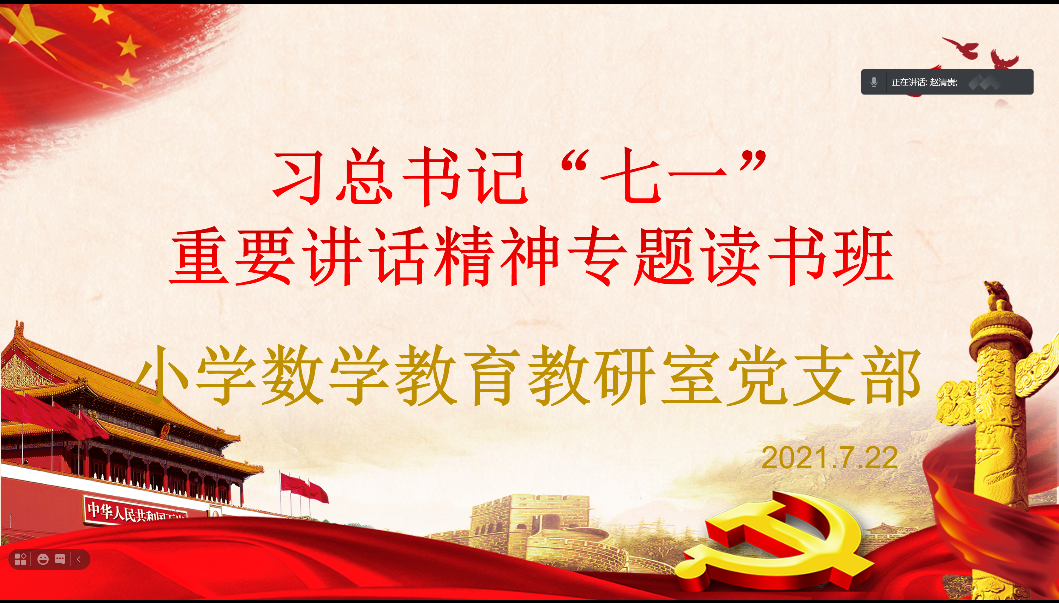 根据中共人妻 党史学习教育领导小组办公室和人妻 党总支的安排,7月22日下午,小学数学教育教研室党支部全体党员通过腾讯会议开展线上学习习近平总书记“七一”重要讲话专题读书班和专题组织生活会活动,会议由党支部书记赵清贵主持。