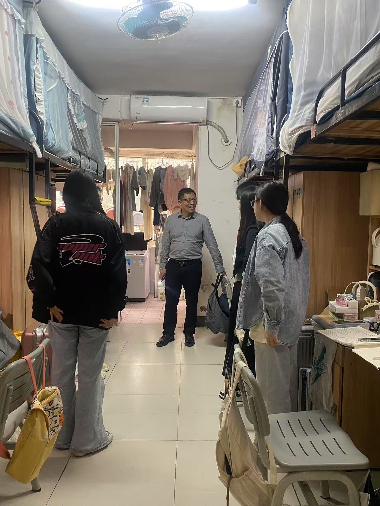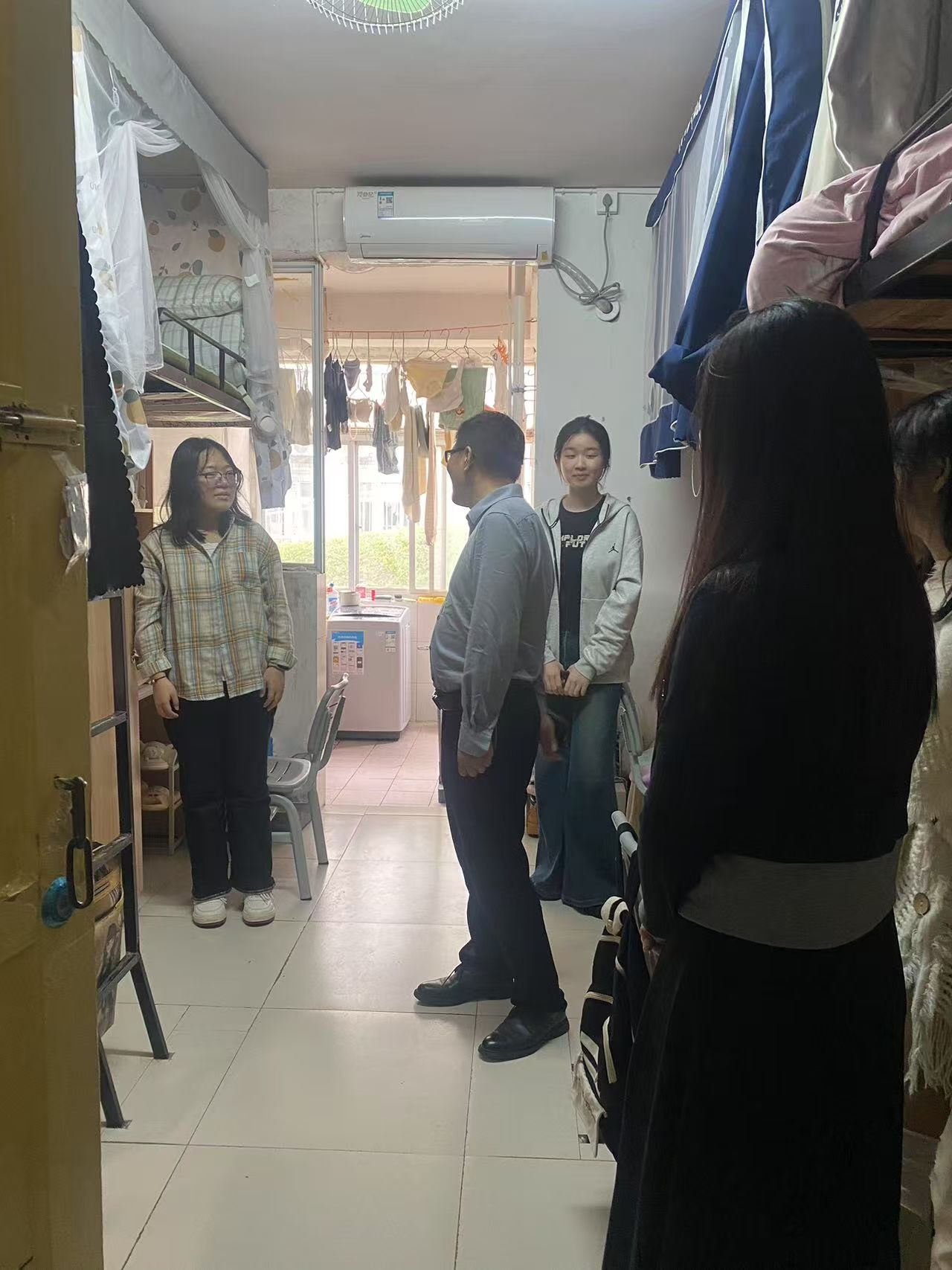 书记下寝 | 聚焦安全与文明,夯实学风建设根基 发布时间:2025-03-27 作者: 浏览次数:次 3月27日下午,人妻 党委书记阮东彪、副书记申鸣凤带领辅导员走访4栋学生宿舍,围绕宿舍安全规范展开检查,排查违规电器使用隐患、指导标准化内务整理流程,要求大家共同营造文明有序的宿舍环境。重点强调搞好寝室建设,提醒同学们抓好学风建设。