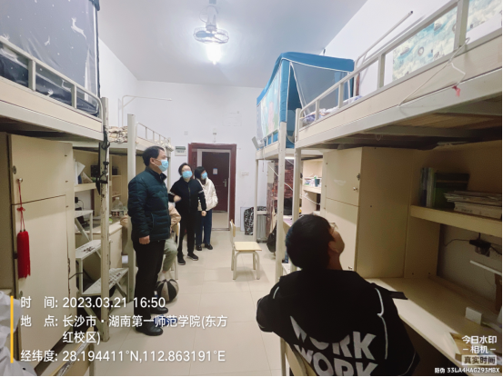 书记下寝 | 注意用水用电安全、营造安全舒适环境 发布时间:2023-03-22 作者: 浏览次数:次 3月21日下午,人妻 党委书记曾玉华、副书记李静、专职组织员禹小英和辅导员罗辉庭一起下寝开展寝室卫生和安全检查,督促同学们要养成良好的卫生习惯、注意用电安全,营造一个安全舒适的寝室环境。同时强调要认真学习专业知识、打好基础!