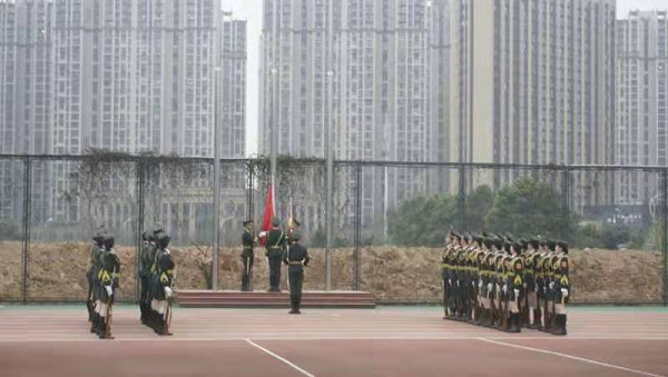 伴随国歌声奏响,五星红旗冉冉升起,随风飘扬。全体师生庄严肃立,齐唱国歌,面向鲜红的五星红旗行注目礼。