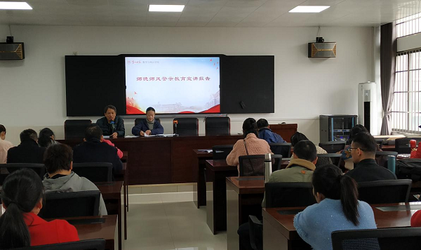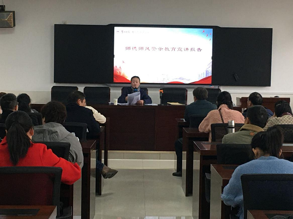 于玉衡北305室召开师德师风专题学习暨师德师风警示教育宣讲会,校党委组织部副部长蒋莉、学院全体党政领导及教师参加会议。会议由院党委书记曾玉华主持。