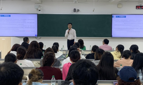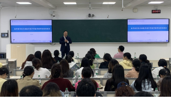 学生亲切交流,句句犹如智慧的甘霖,滋润着学生们的心灵。袁智强教授以其渊博的学识和深厚的学术底蕴,为学生带来了主题为“数学教育技术赋能卓越中学数学教学教师培养的探索”的精彩讲座,带领学生畅游在数学研究的浩瀚星河里。讲座后的答疑环节,袁智强教授对学生提出的考研择校择专业、师范生技能大赛准备等问题,细致入微地剖析并耐心解答,为学生拨云见日。随后,两院学生积极互动,展开深度交流,每一次对话都闪耀着思想碰撞的光芒,欢声笑语中友谊的种子也悄然种下。