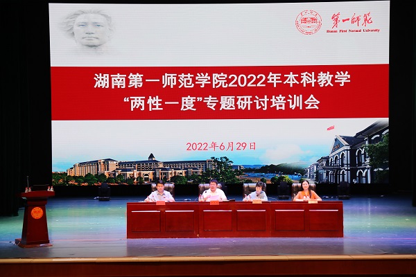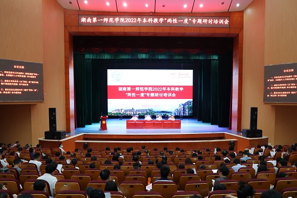 为贯彻落实教育部、省教育厅关于课程建设的相关文件精神,全面落实学校《关于贯彻落实办学新理念服务“强师计划”和“强省会战略”的实施意见》和《关于推进课程“两性一度”建设三年行动计划》,准确把握“两性一度”内涵,大力促进教育教学理念更新,切实提高人才培养质量,6月29日上午,我校在东方红校区田汉剧场举行2022年本科教学“两性一度”专题研讨培训集中学习会议。校党委书记罗成翼、校长童小娇、副校长周发明、副校长蒋蓉出席会议。教务处、教学质量监控与教师教学发展中心、各学院全体教职员工参加会议。会议由童小娇主持。