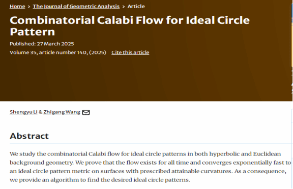 教师李盛禹与王智刚合作,在《Journal of Geometric Analysis》上发表了题为“Combinatorial Calabi flow for ideal circle pattern”的学术论文。