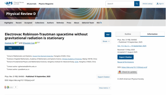 教师何孝凯与中国科学院数学与系统科学研究院曹周键研究员合作在《Physical Review D》上发表题为 “Electrovac Robinson-Trautman spacetime without gravitational radiation is stationary” 的学术论文。