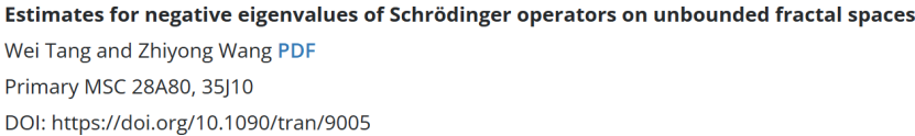 教师唐微博士与王志勇博士合作在《Transactions of the American Mathematical Society》上发表题为“Estimates for negative eigenvalues of Schrödinger operators on unbounded fractal spaces”的学术论文。