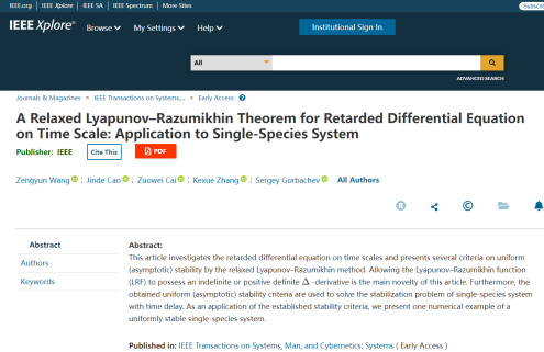 教师王增赟教授与东南大学数学学院曹进德教授、湖南女子学院蔡佐威副教授、加拿大女王大学张科学教授、俄罗斯托木斯克国立大学的Sergey Gorbachev教授合作在著名期刊《IEEE Transactions on Systems, Man, and Cybernetics: Systems》上发表题为“A relaxed Lyapunov-Razumikhin theorem for retarded differential equation on time scale: Application to single-species system”的学术论文。