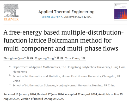 教师杨旭光与香港理工大学乔中华教授,南京师范大学张雨泽博士合作在传热学领域国际顶刊《Applied Thermal Engineering》(JCR一区,中科院一区,影响因子6.1)上发表题为“A free-energy based multiple-distribution-function lattice Boltzmann method for multi-component and multi-phase flows”的学术论文,人妻
