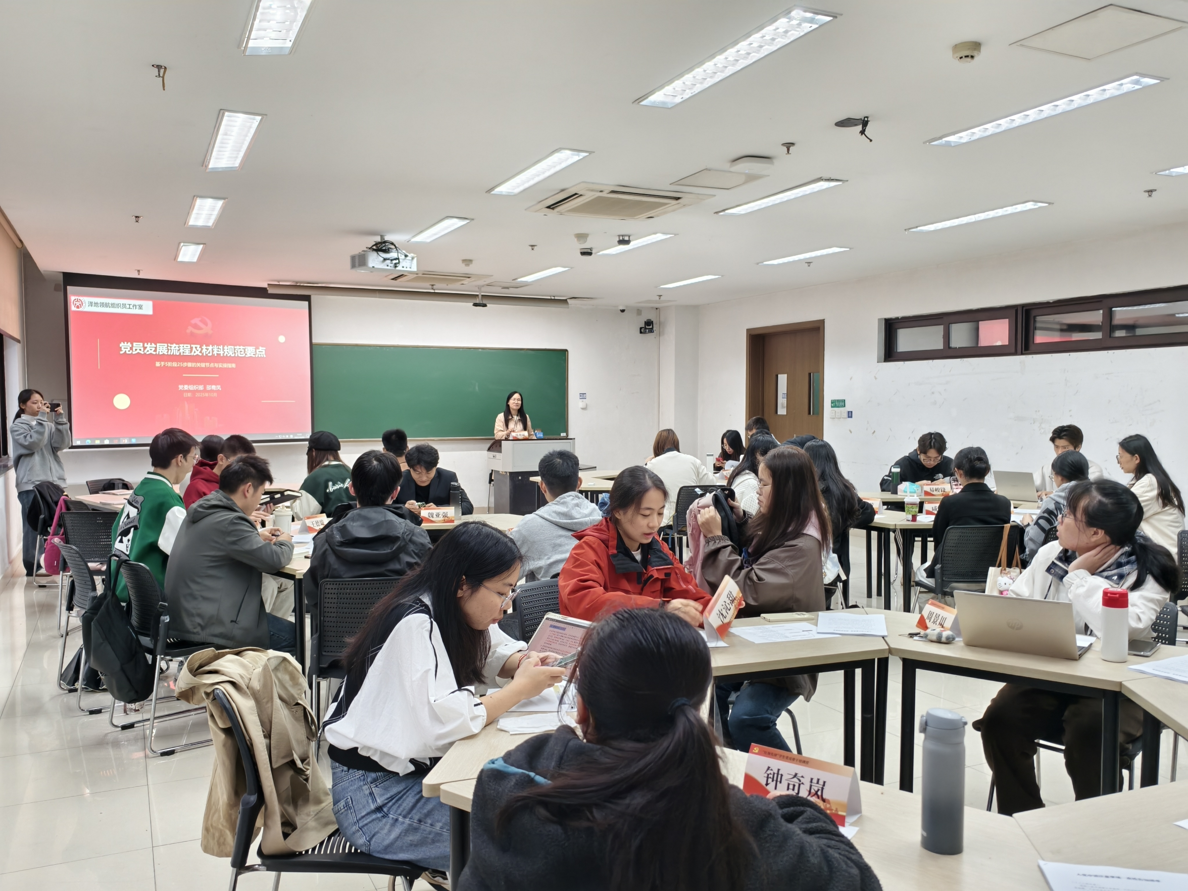 培训伊始,邵鸯凤强调了党员发展材料在党建工作中的重要性。“党员发展材料是记录个人政治生命成长的重要档案,也是党组织考察、培养党员的关键依据。”她指出,材料的规范性、严肃性直接关系到党员发展质量,必须以高度负责的态度对待每一份表格、每一项内容。其次,围绕《中国共产党发展党员工作细则》,邵鸯凤为学员们系统梳理了党员发展的“五个阶段、二十五个步骤”全流程,她逐步逐条梳理了党员发展全流程所需的各类材料清单,包括入党申请书、思想汇报、入党积极分子培养考察表、政审材料、党小组意见、支部大会决议等。最后,邵鸯凤以时间轴形式,清晰标注了从递交入党申请书到预备党员转正的各个关键节点:“递交入党申请书后,党支部应在1个月内派人谈话;确定为入党积极分子后,需经过至少1年的培养教育方可列为发展对象;预备党员预备期为1年,期满需按时提交转正申请。”邵鸯凤现场剖析了一份典型的《关于协助补充XXX同志党员发展材料的函》错误案例。该案例揭示了在实际工作中,因材料填写不规范、时间逻辑错误、关键信息缺失或前后不一致(如支部名称记录矛盾、考察登记表与志愿书信息不符、转正申请书落款时间涂改等)可能导致的严重后果。通过这一反面教材警示全体学员,发展党员工作必须一丝不苟,任何细微的疏漏都可能影响党员身份的严肃性,甚至为个人后续发展带来不必要的麻烦。针对材料填写中常见的易错点,邵老师特别强调了“三个一致”:时间逻辑要一致、内容表述要一致、签名盖章要一致。