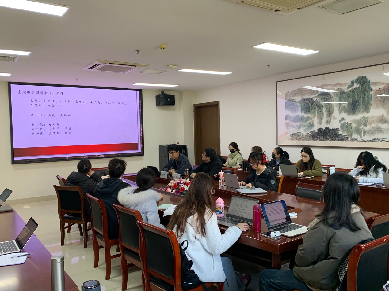 2025年11月12日上午,复旦大学中文系副教授赵惠俊应邀来我院讲学,其主要研究方向为词学、宋代文学与文献,兼及通俗文学研究。此次讲题为“南宋后期两浙词人群体文本网络构建及其近世性意义——以周密词为考察基准点”,讲座由我院楼培老师担任主持人,姜荣刚老师及研究生、本科生共40余名师生参加。